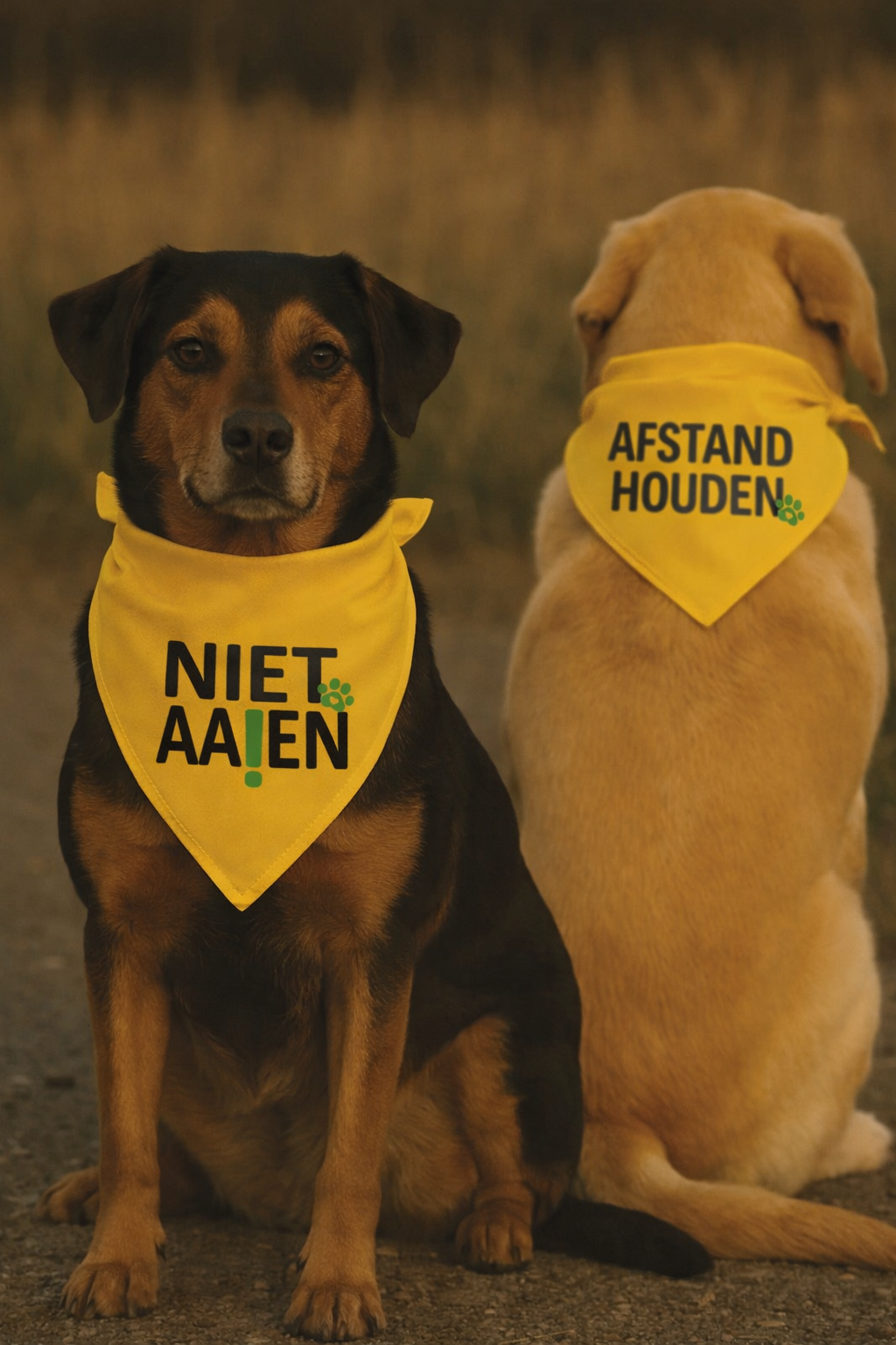 Onze gele dieren bandana maakt duidelijk: even geen geaai, geen drukte, alleen rust en ruimte.